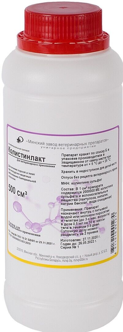 Показания к применению: Колистинлакт применяют для лечения поросят и телят при желудочно-кишечных заболеваниях бактериальной этиологии, в том числе колибактериозе, сальмонеллезе и других инфекциях, возбудители которых чувствительны к колистину.
