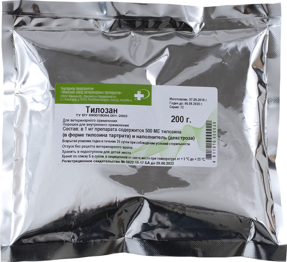 Показания к применению: Препарат применяют для профилактики и лечения респираторного микоплазмоза кур, инфекционного синусита индеек; терапии свиней, больных дизентерией, рожей, гастроэнтероколитами бактериальной этиологии, а также телятам в качестве лечебно-профилактического средства при бронхопневмониях, вызванных возбудителями, чувствительными к тилозану
